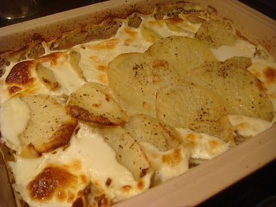 - peel a couple of very large potatoes and slice (no more than 0.5cm thick) - you need enough to fill whatever oven dish you're planning on using